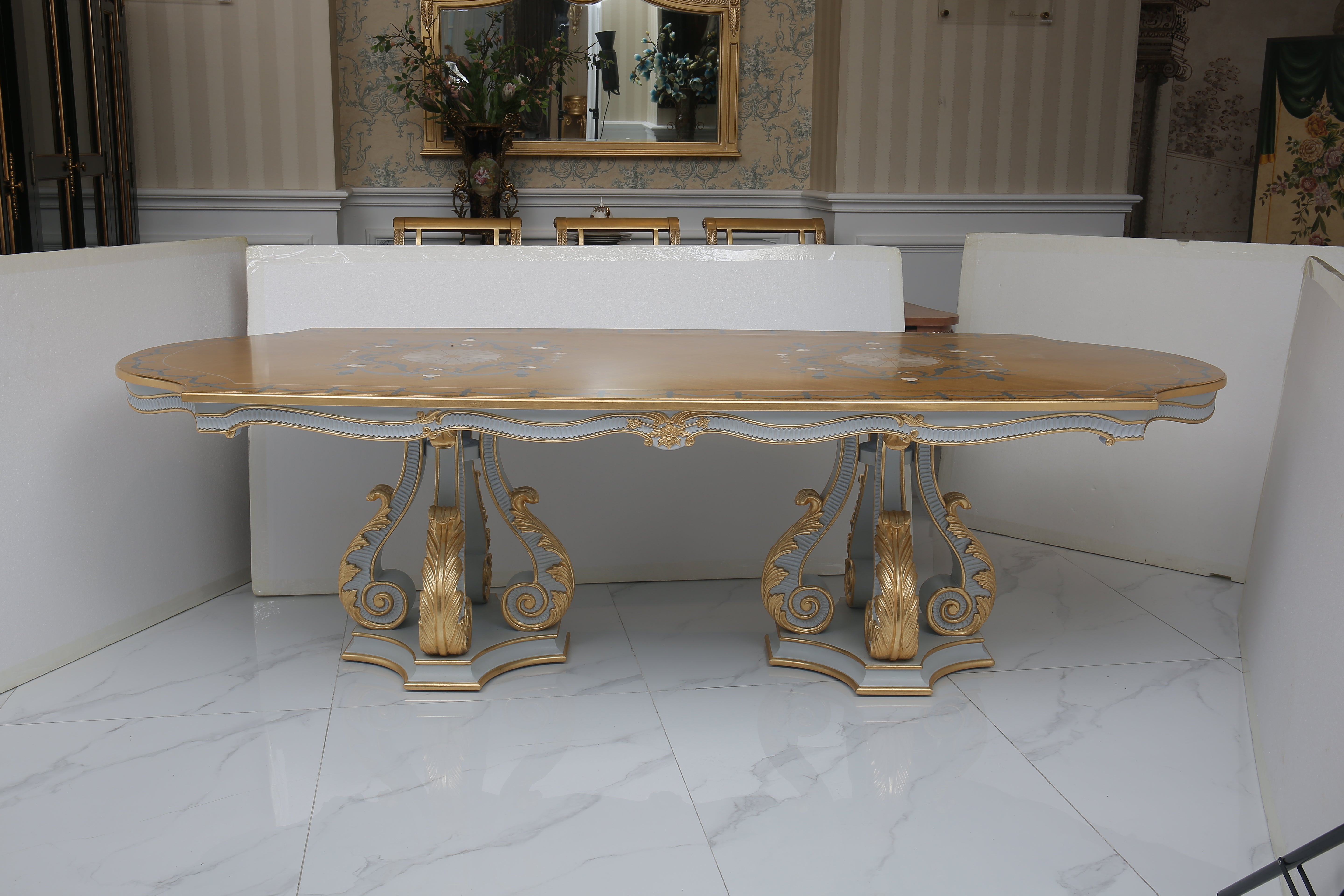 Every detail of D-085 showcases exceptional artistry. It features solid wood construction with hand-inlaid gold motifs, paired with a polished wooden finish and elaborate detailing — hallmarks of French luxury furniture. The meticulous craftsmanship in its construction makes it a standout example of an oval dining table reimagined with opulent allure, fitting the luxury dining table and dining tables dining room aesthetics seamlessly.