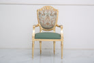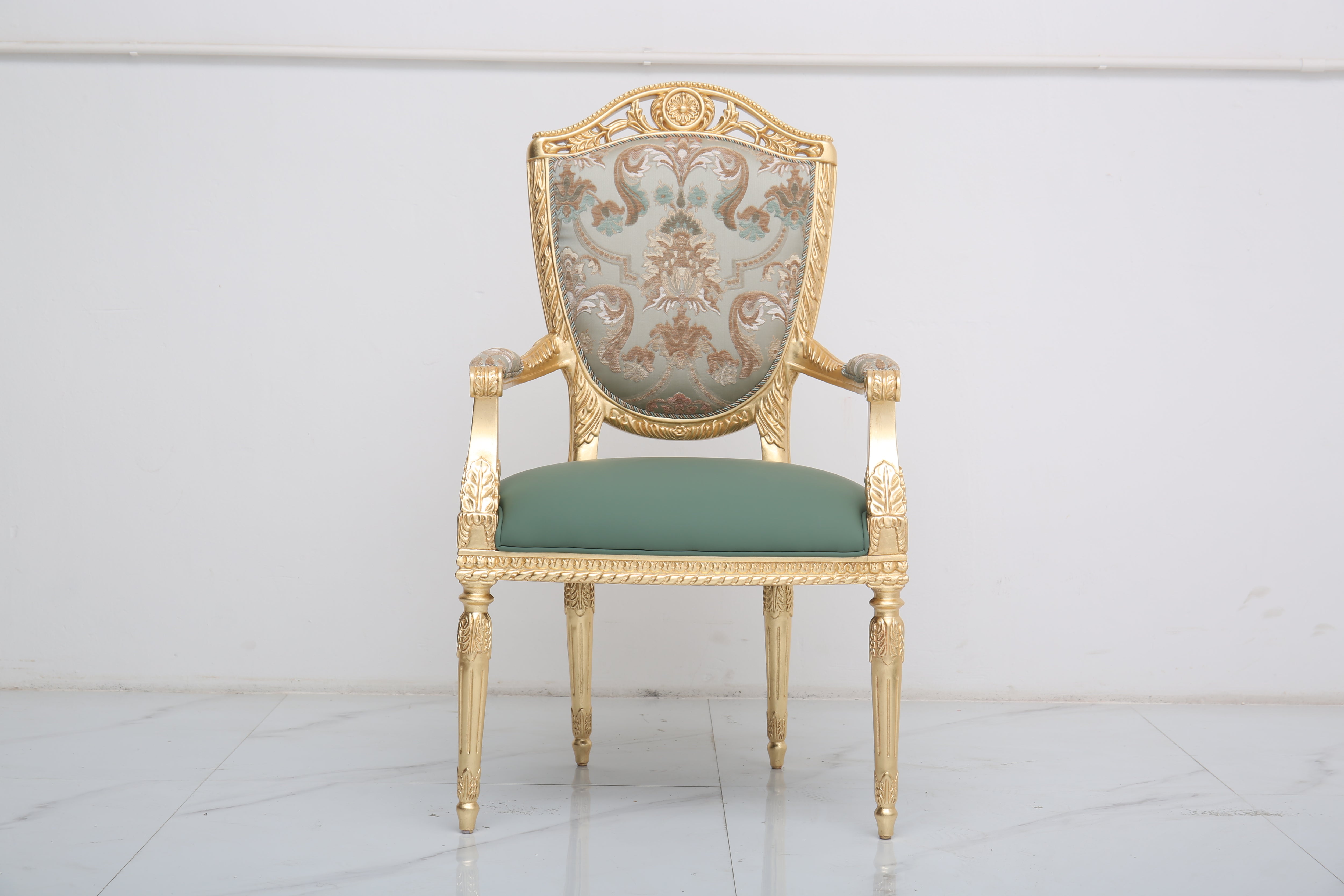 Every detail of A-269 showcases exceptional craftsmanship. It features hand-carved wooden elements finished in lustrous gold, paired with premium green upholstery and intricately patterned backrest — hallmarks of French antique furniture. The meticulous artistry in its construction makes it a standout example of antique french armchair reimagined with opulent allure, fitting the upholstered dining armchair aesthetic seamlessly.