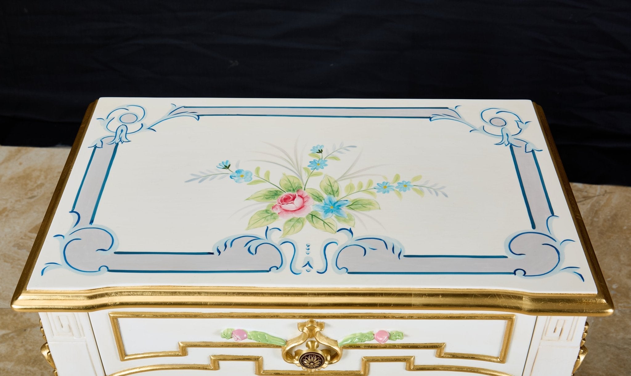 Introducing the vintage nightstands piece N-38, a French-inspired nightstand with hand-painted floral details and gold trim, crafted to be the elegant accent of your bedroom. It’s not just a storage piece; it’s a blend of French artistry and functional charm, perfect for curating a space that exudes timeless, hand-painted sophistication.