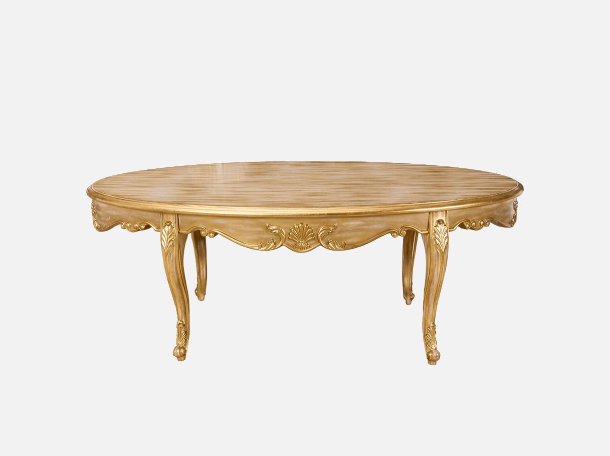 Boasting an elegant, oval silhouette with ornate gold leaf-trimmed carvings and sculpted cabriole legs, the coffee table’s design embodies “French salon glamour”. The seamless blend of beech wood artistry, gold leaf detailing, and wood-veneer luxury enhances its timeless appeal, making it a focal point in any living space.