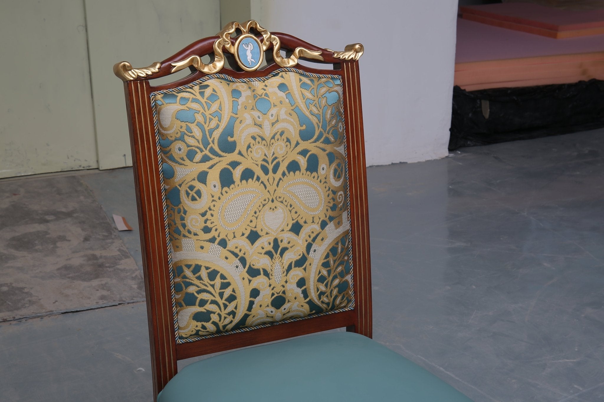 Every detail of DC-078 showcases exceptional artistry. It features solid wood construction with a hand-embroidered backrest, paired with premium teal upholstery and delicate gold detailing — hallmarks of French vintage furniture. The painstaking craftsmanship in its construction makes it a standout example of a vintage dining chair reimagined with timeless allure, fitting the upholstered chairs and dining room chair aesthetics seamlessly.